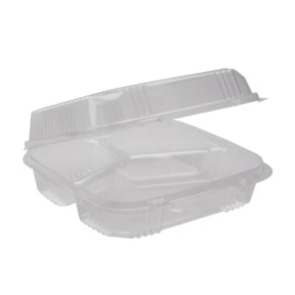 8×8 clear hinged plastic takeout containers with three compartments and SmartLock closure, ideal for visible food presentation and secure delivery.